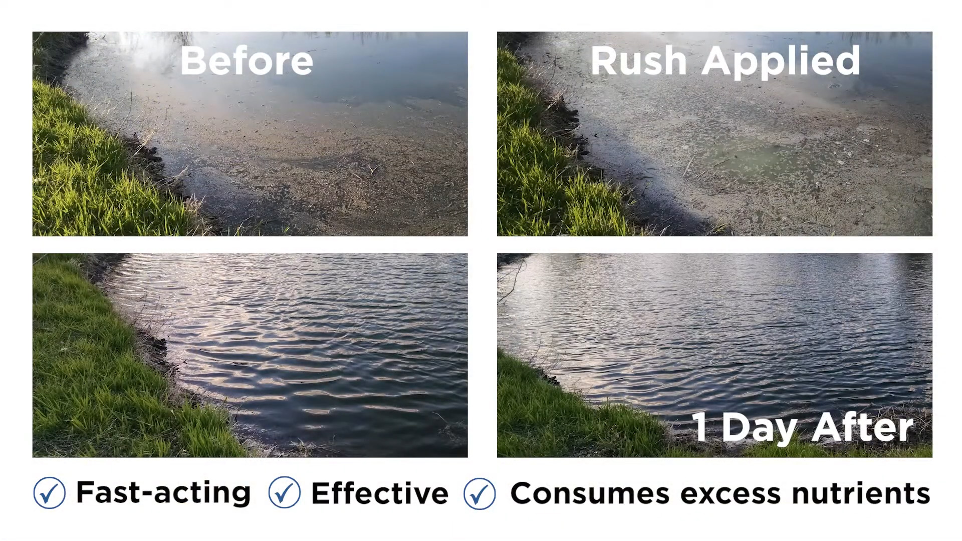 RUSH® is the go-to solution for improving water quality in stagnant ponds, especially those with thick, matted organic buildup and algae on the surface.